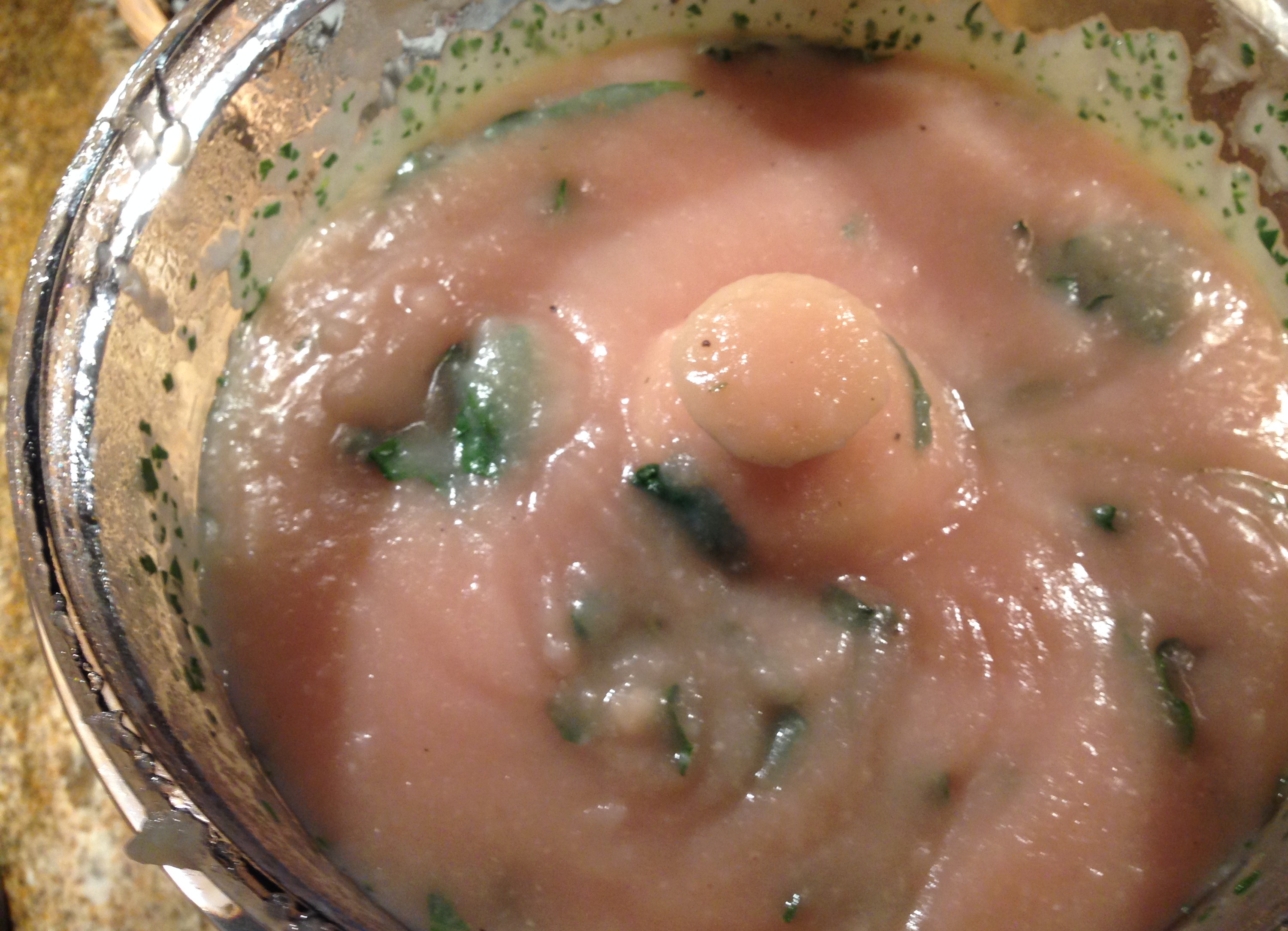 If you opt to use your CSA purple potatoes and find that you have just created an unappetizingly pink soup, don’t panic—the addition of the kale adjusts the color back to “potato” ;). See above photo.