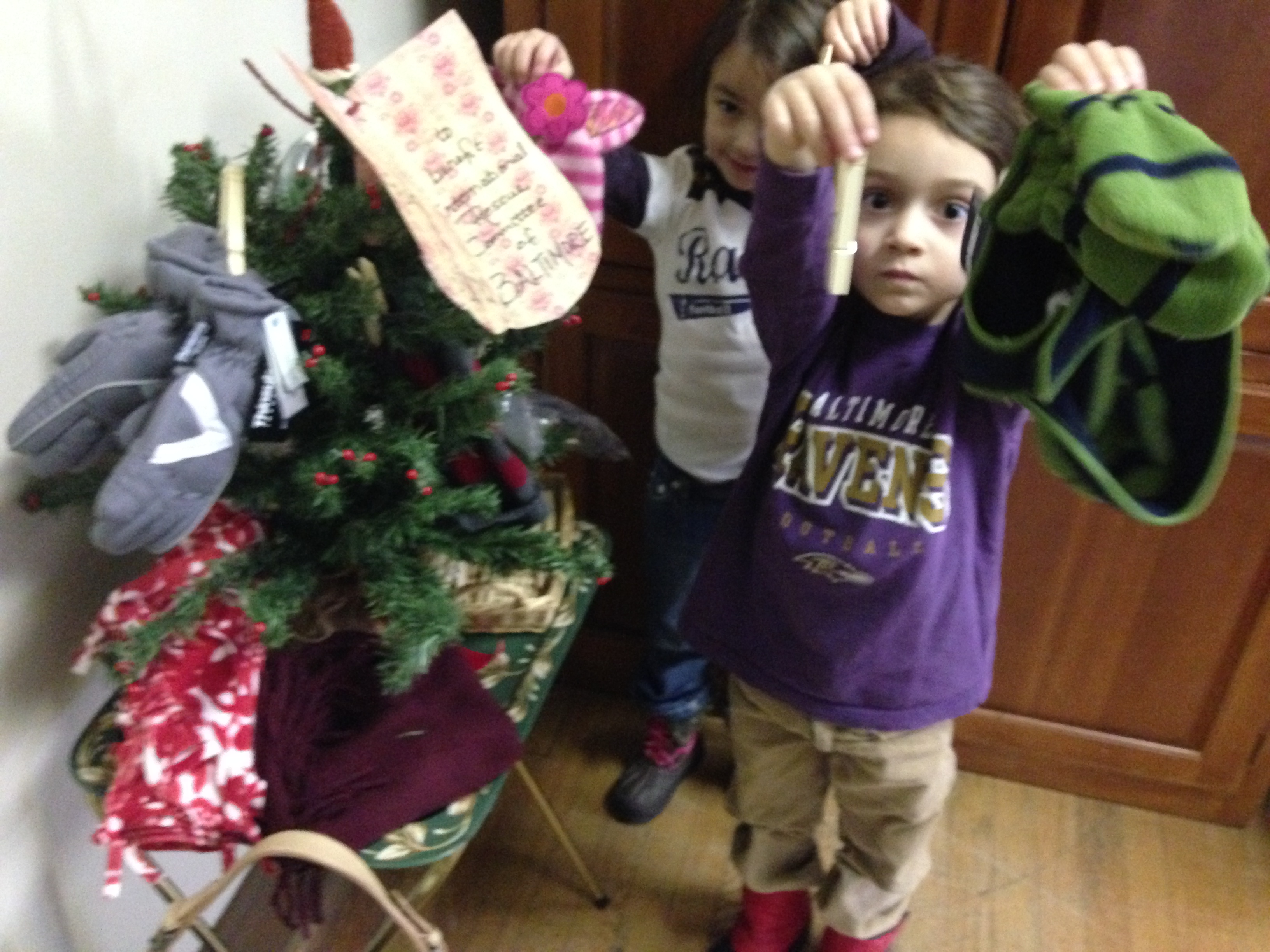 These students use clothespins to attach hats and matching mittens to the primary classes’ Mitten Tree. (The Ravens did win that day, surely due in part to this show of spirit among the little ones.)
