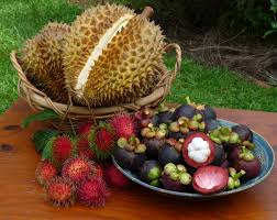 Durian (basket) smells like the essence of putrefaction, but the custardy flesh is unparalleled for flavor. Thais call it “hell on the outside; heaven on the inside.” Whereas durian is the king of Thai fruit, mangosteen (plated) is the queen—silky, sweet, and fragrant—and nothing at all like mango, despite the similar name. Rambutan (forefront) is similar to the lychee but with firmer, yet still succulent flesh.