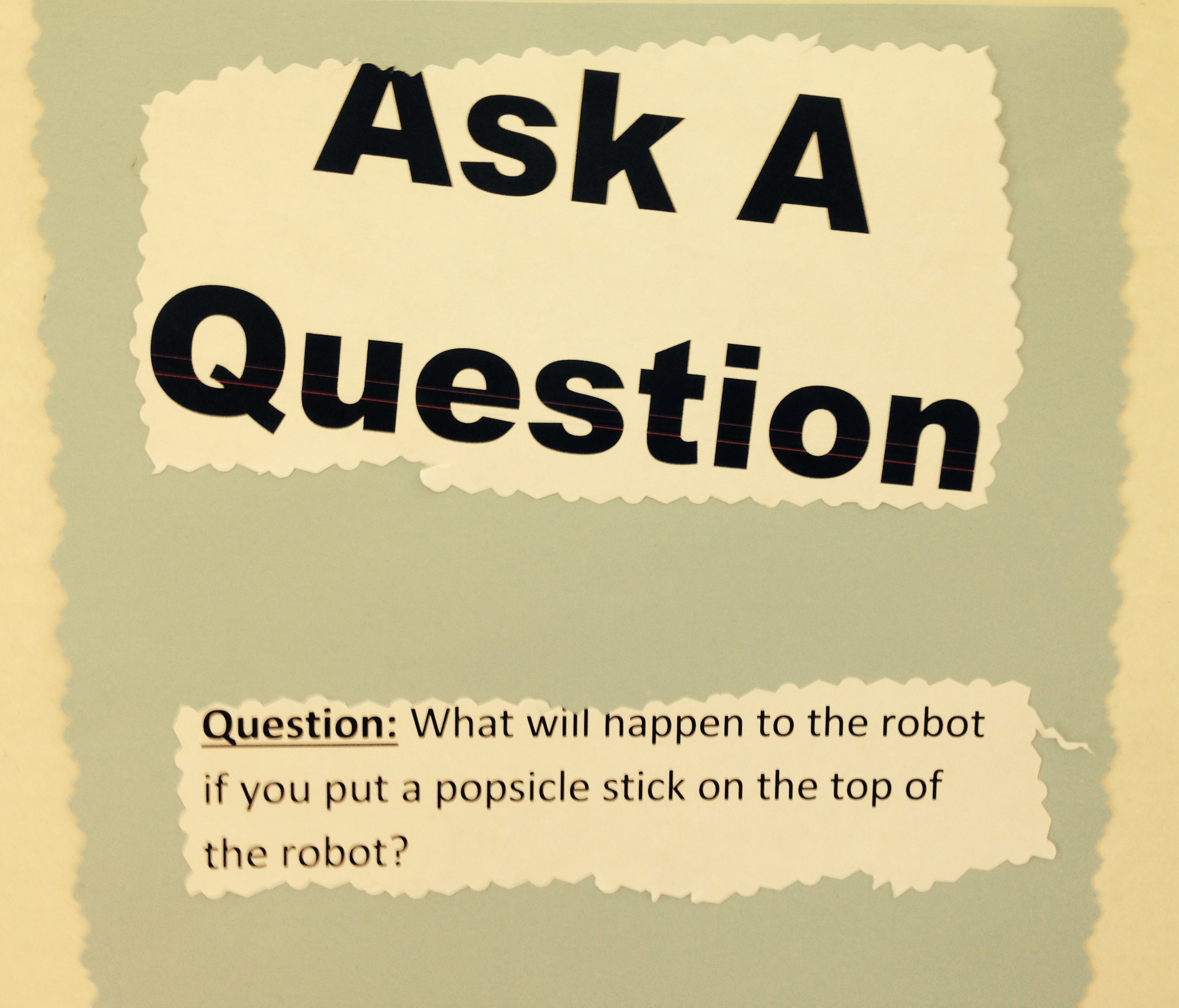 Ask a question ← Previous Next → What will happen to the robot if you pit a popsicle stick on the top of the robot? Like this:Like Loading... Share this: Email a link to a friend (Opens in new window) Email Share on X (Opens in new window) X Share on Facebook (Opens in new window) Facebook Share on Pinterest (Opens in new window) Pinterest More Share on Tumblr (Opens in new window) Tumblr Share on Reddit (Opens in new window) Reddit Print (Opens in new window) Print Like this:Like Loading...
