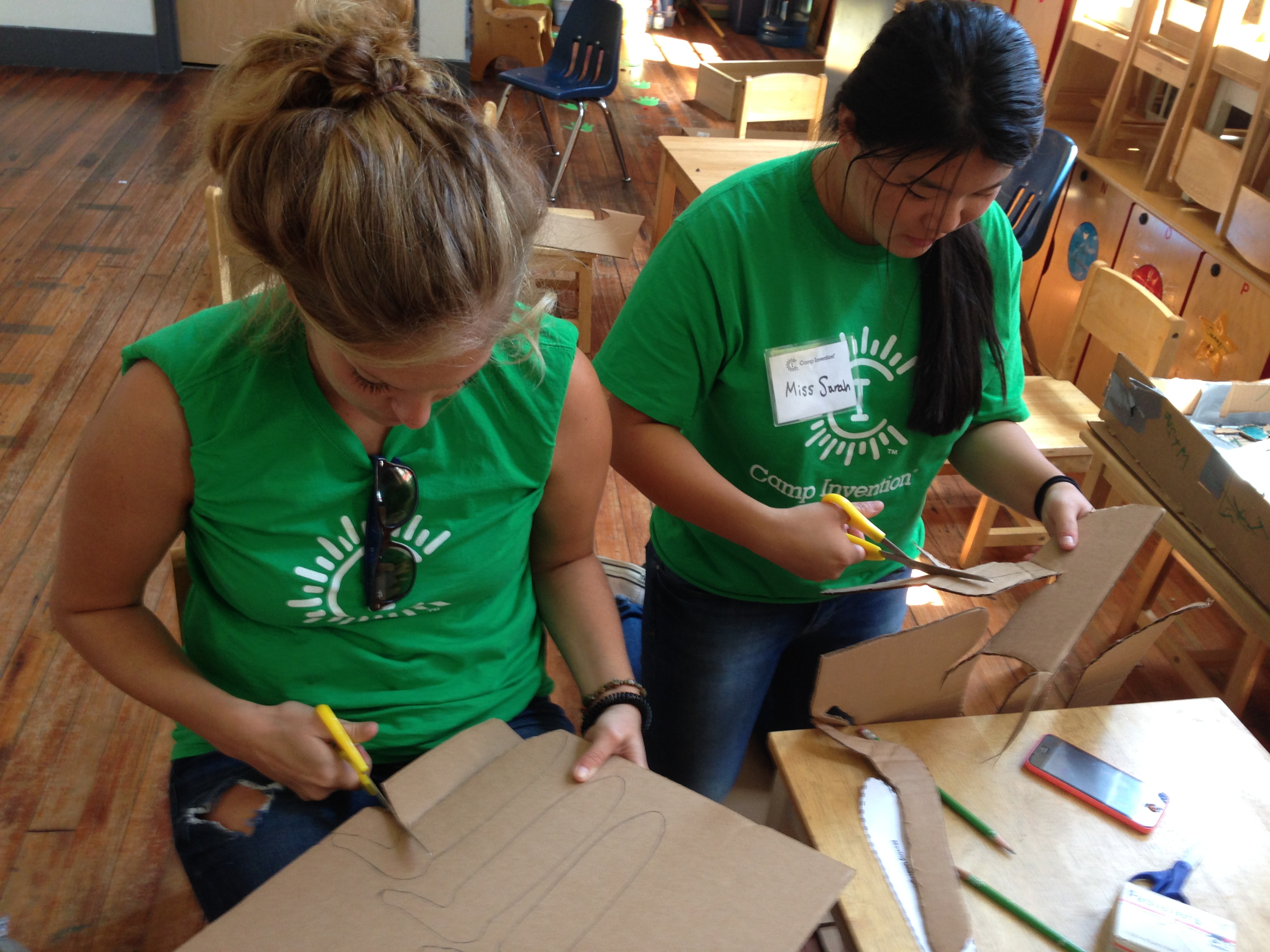 Camp Instructors Miss Katie (left) and Miss Sarah (right) help the 1st-grade campers with some of the more arduous cardboard cutting, but constructing the pinbug machines will be all done by the campers themselves.
