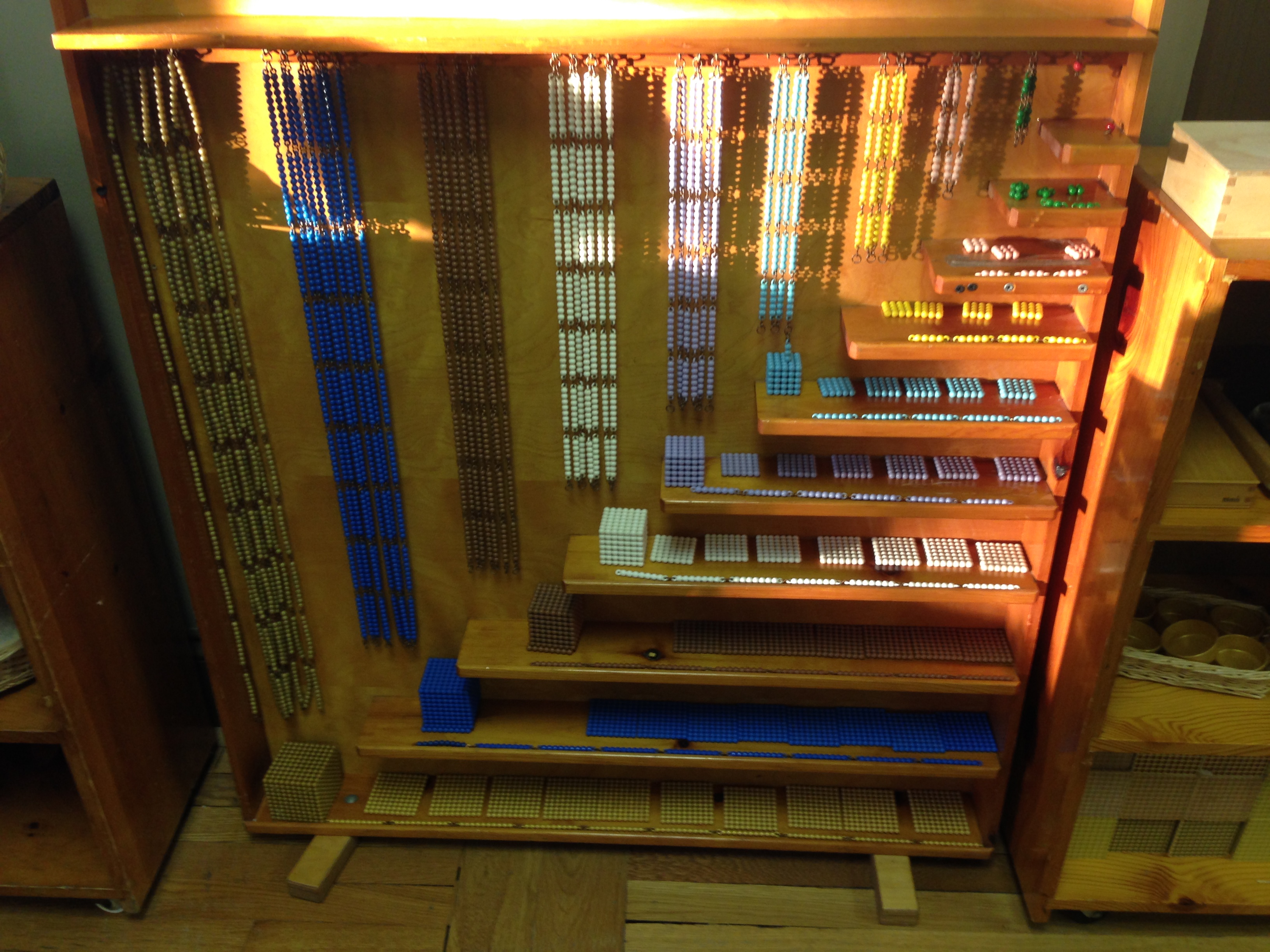 Ahhh the Bead Cabinet . . . that quintessential Montessori material that draws kids to explore it with their senses but teaches math concepts and abstractions in a stepwise fashion throughout the 3-year cycle.