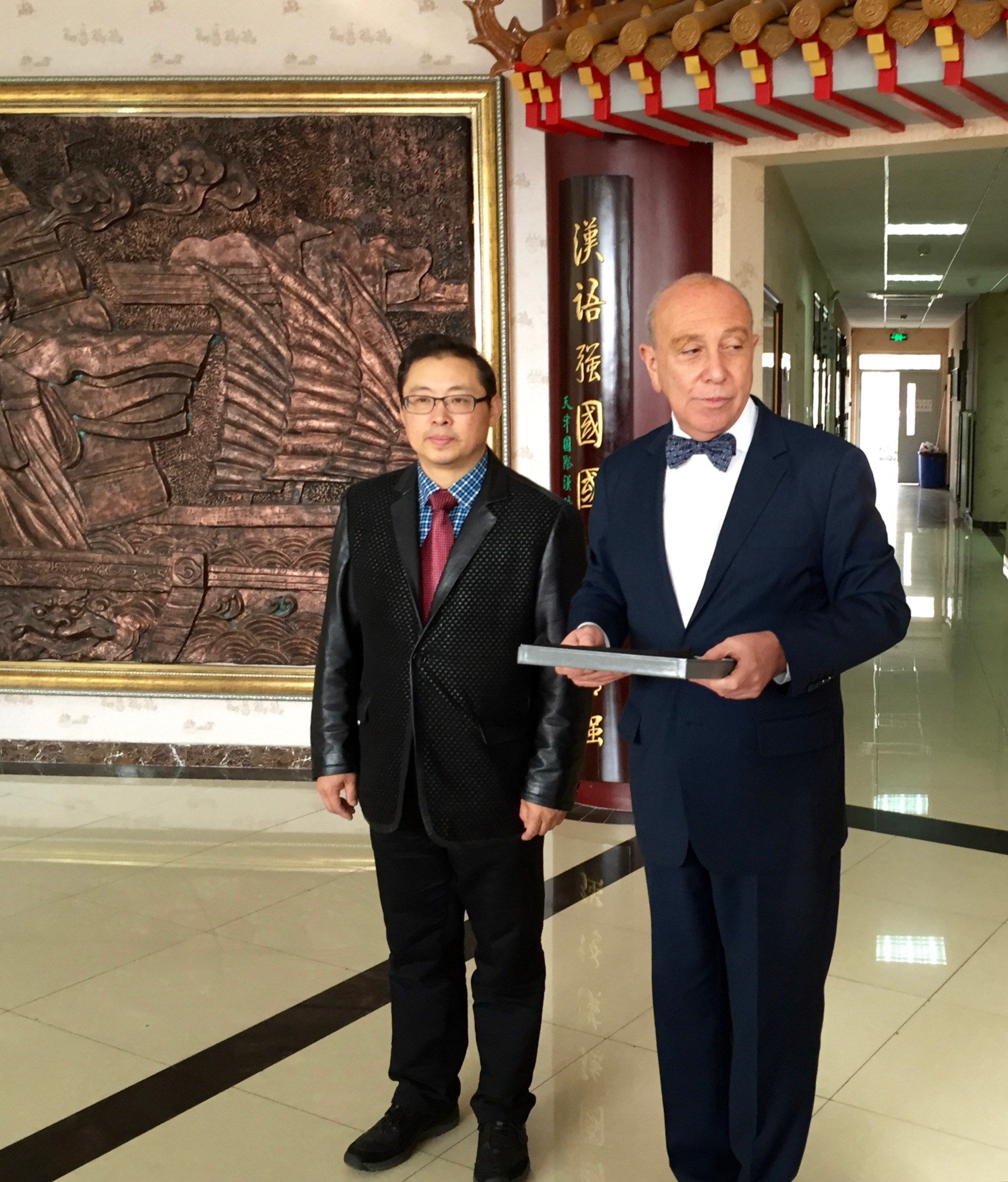 The president of Tianjin International Chinese College, Zhao Hongtao, is presented with a plaque of appreciation by College Board vice president, Jim Montoya.