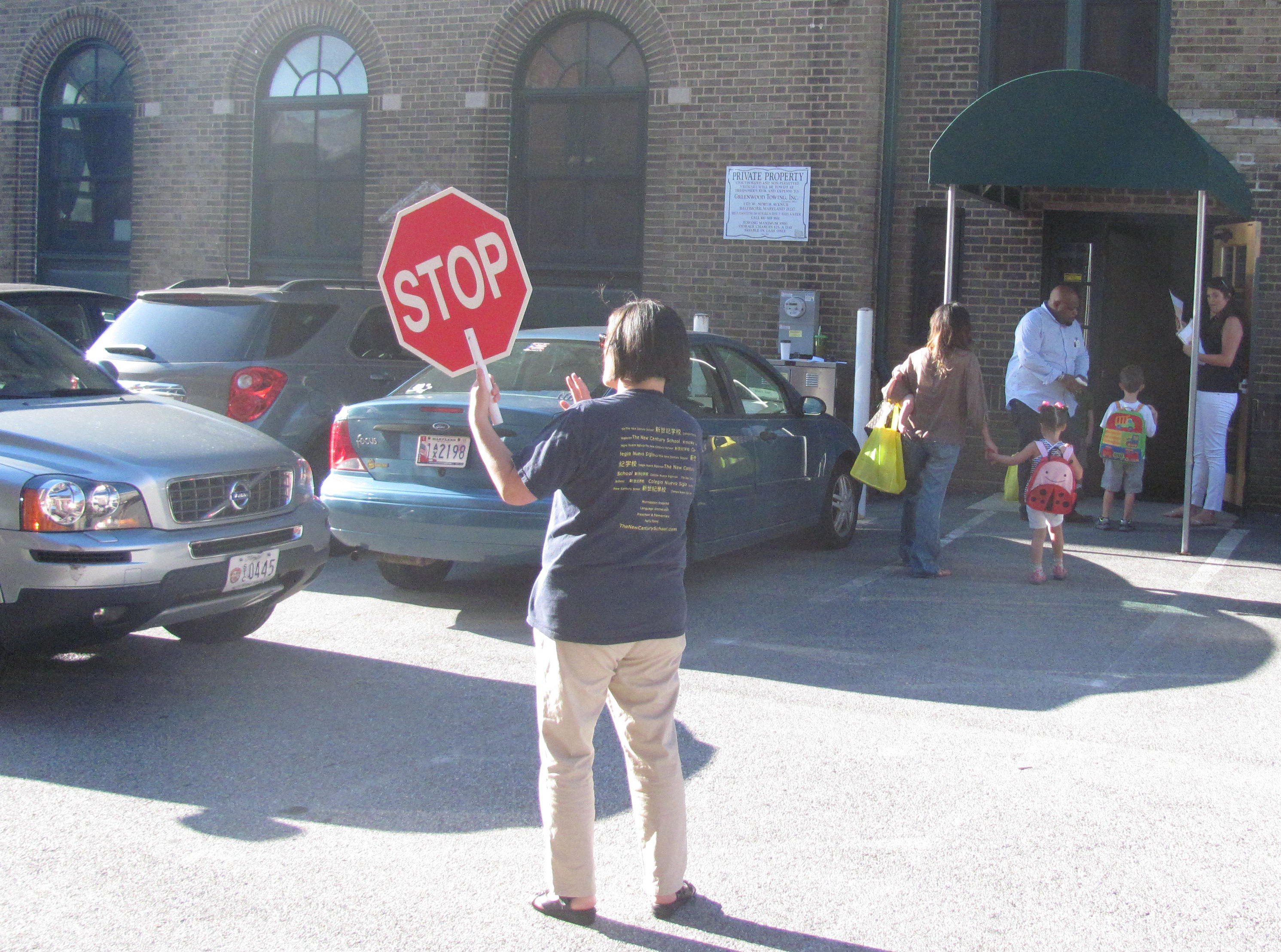 Xie Laoshi directs traffic to proceed slowly but continuously through the carline to maintain efficiency while keeping staff and students safe. Ms. Duprey checks each student in individually, and Mr. Warren escorts them safely into the building.